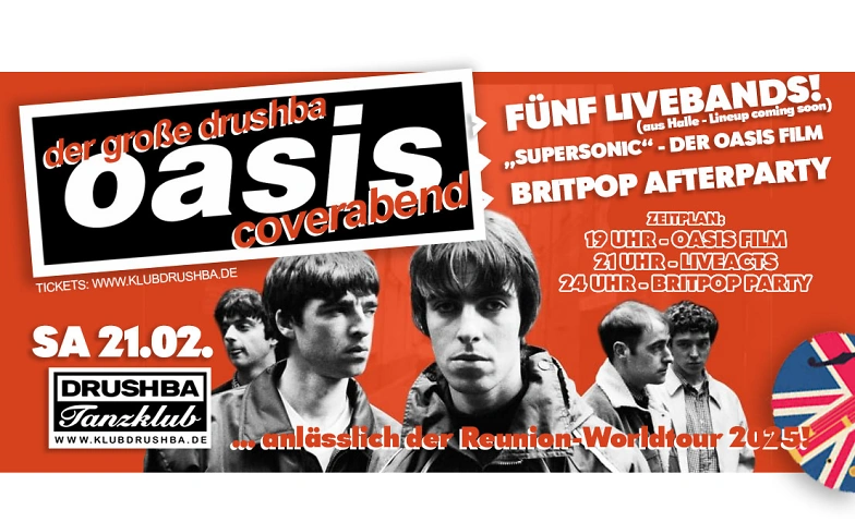 Der große Oasis Coverabend  5 Bands + Film + Britpop Party Klub Drushba, Kardinal-Albrecht-Straße 6, 06108 Halle (Saale) Billets