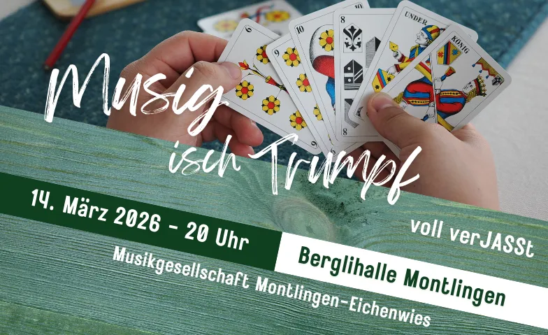 Die Musikgesellschaft Montlingen-Eichenwies lädt herzlich zum diesjährigen Unterhaltungsabend mit dem Motto "Musig isch Trumpf - voll verJASST" ein. Freuen Sie sich auf einen abwechslungsreichen, humorvollen und musikalisch vielseitigen Abend, bei dem die Karten ganz neu gemischt werden.