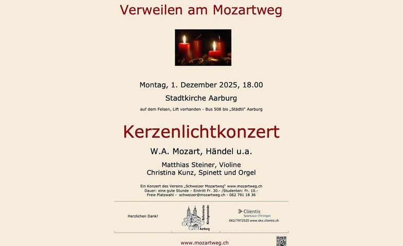 Herzlich willkommen am 1. Dezember 2025, 18 Uhr, Stadtkirche Aarburg, Bushalt (508) „Städtli“ ab Bhf Olten / Aarburg Eintritt Fr. 30.- / Kinder Dr. 10.-schweizer@mozartweg oder 062 791 18 36 – Freie Platzwahl