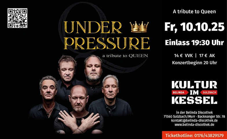 Kultur im Kessel, das Kulturprogramm in der Belinda Discothek präsentiert: „Under Pressure“ die besten Songs aus der langen Musikgeschichte, die Queen geschrieben hat. Über 50 Jahre stehen Queen nun schon auf der Bühne und auch wenn der Tod von Freddie Mercury eine große Lücke hinterlassen hat, die Musik dieser großartigen Band lebt weiter. Eine Musik, die Rock, Pop, Glamour, Theatralik und Bombast in genialer Weise miteinander verwoben hat und aus dem Alltag vieler Menschen nicht wegzudenken ist. Wer hat nicht schon zu „We will rock you“ auf den Boden gestampft oder bei einem erfolgreichen Abschluss lauthals „We are the Champions“ mitgesungen? Wem hat an der Schwelle zum Erwachsenwerden nicht „Spread your wings“ eine tolle Zukunft versprochen und wer hat nicht schon zum coolen Bassriff von „Another one bites the Dust“ getanzt? „Under Pressure“ bieten weltberühmte Songs, emotionale Momente, ein wenig Nostalgie und die volle Rockdröhnung ganz ohne Hofzeremoniell.