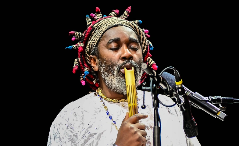 Der in Deutschland lebende kamerunische Vokalist, Multiinstrumentalist, Komponist, Erzähler und Musiktherapeut ist ein echter Ausnahmekünstler. Atemberaubend ist seine Trommelkunst, polyrhythmische Magie wechselt mit melodischer Zauberei, die ihre Inspiration aus dem Reichtum traditioneller Musik seiner Heimat und der ganzen Welt schöpft – das klingt auch gerne mal nach Jazz, oder orientalischer und europäischer Klassik. Und sein Gesang! Egal ob flötengleiches Falsett oder samtig-erdiger Bariton, Njamys müheloser Klang verkörpert seine Musikvision von Resilienz und Einklang mit der Natur. „Kaum zu glauben, dass da nur ein einzelner Künstler auf der Bühne steht.“ (Augsburger Allgemeine)
