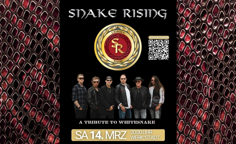 Am 14. März 2026 kommt SNAKE RISING um 20:00 Uhr in die WERK°STADT und heizt euch als Whitesnake Tribute Band richtig ein.