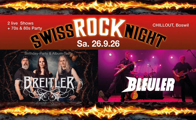 Den 26.09.2026 sollten Rockfans in der Region nicht verpassen. Im Chillout Boswil feiern Caroline und ihre BREITLER Band Plattentaufe und den 40. Geburtstag der Zuger Sängerin. Dazu stürmt das Powertrio BLEULER die Bühne, eine Mundart-Rockband aus Zürich um den langjährigen Gitarristen von Gölä. Zuletzt legt ein Rock-DJ auf. Die Besucherinnen und Besucher dürfen sich an der Swiss-Rock-Night auf erstklassige Live-Musik im Doppelpack freuen. Prädikat: Hingehen.