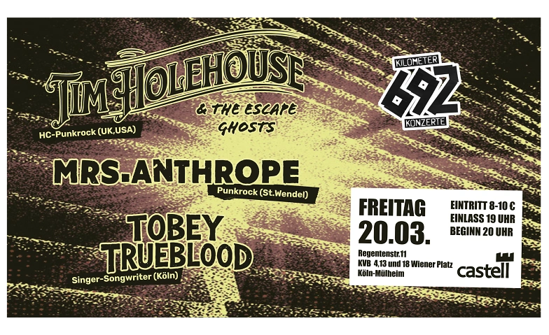 Wir, von Kilometer692Konzerte, freuen uns euch den fantastischen Tobey Trueblood und seine sagenhaften Freund*innen, mrs.anthrope and Tim Holehouse & the Escapegoats, im wunderbaren Castell zu Müllem, Regentenstraße 11 in 51063 Cologne am Freitag den 20.03.'26 präsentieren zu dürfen! Das Schmankerl open the Doors at 19.00 and starts at 20.00