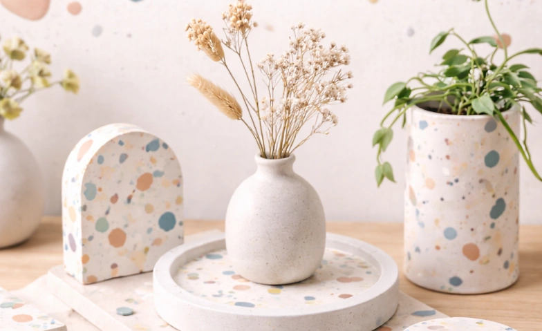 Kreativer Terrazzo Workshop in Ulm: Gestalte dein eigenes Designobjekt aus Farbe, Form und Struktur – für Anfänger geeignet.