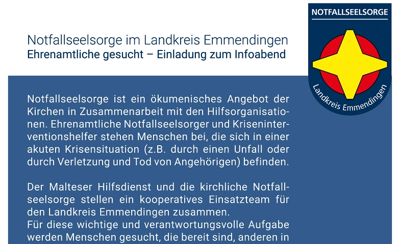 Die Notfallseelsorge ist ein gemeinsames Angebot der Kirchen in Kooperation mit dem Malteser Hilfsdienst. Sie begleitet Menschen, die durch plötzliche Schicksalsschläge wie Unfälle oder den Verlust nahestehender Personen in seelische Ausnahmesituationen geraten sind.