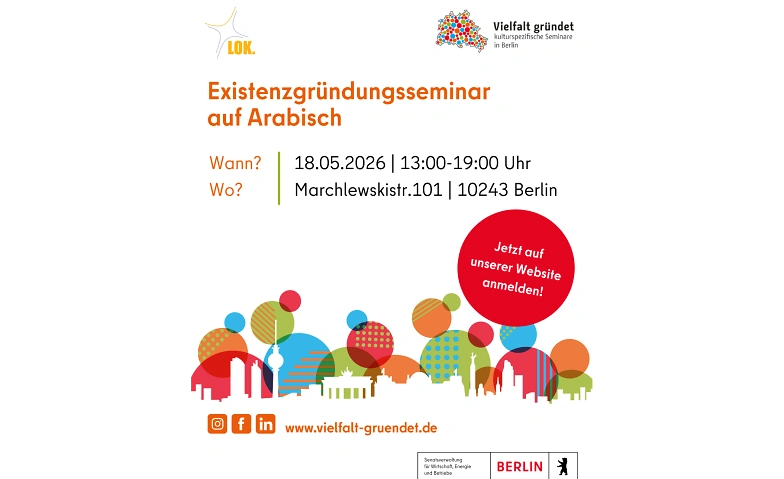 Dann melden Sie sich hier für unser erstes kulturspezifisches Orientierungsseminar auf Deutsch und Arabisch an! An einem Tag bekommen Sie die wichtigsten Informationen zum Thema Gründung und werden persönlich und kompetent beraten.