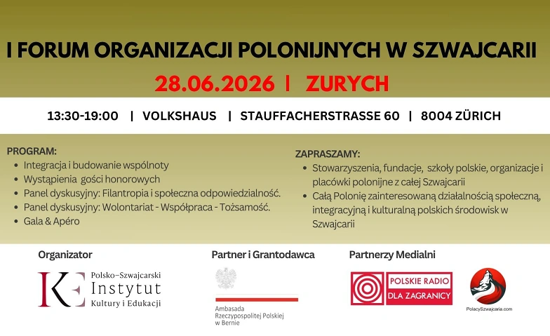 Serdecznie zapraszamy do wzięcia udziału w I Forum Organizacji Polonijnych w Szwajcarii. Wydarzenie organizowane jest przy współpracy z Ambasadą i Konsulatem RP w Szwajcarii.
