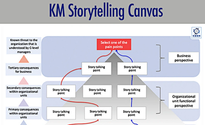 Das KM Storytelling Canvas ist ein neues Tool, mit dem der direkte Zusammenhang zwischen Knowledge Management und wichtigen Unternehmenszielen wie Produktivität, finanziellen Ergebnissen oder effizienter Zusammenarbeit verdeutlicht werden kann.