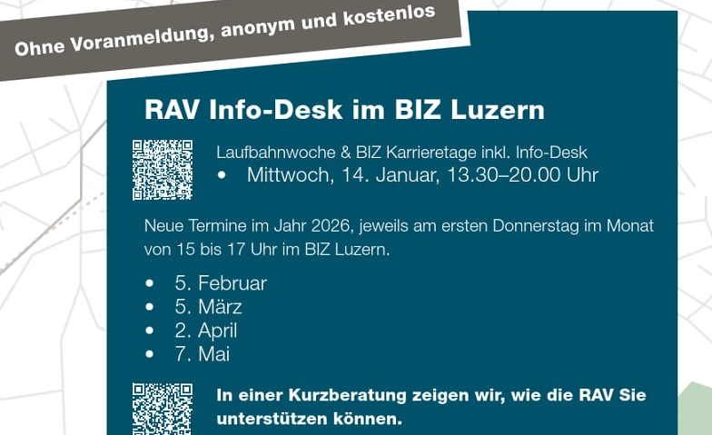 Im Rahmen der Laufbahnwoche Zentralschweiz & BIZ Karriere Tage wird der RAV Info-Desk im BIZ am Mittwoch, 14. Januar 2026 von 13:30 Uhr bis 20:00 Uhr vertreten sein.
