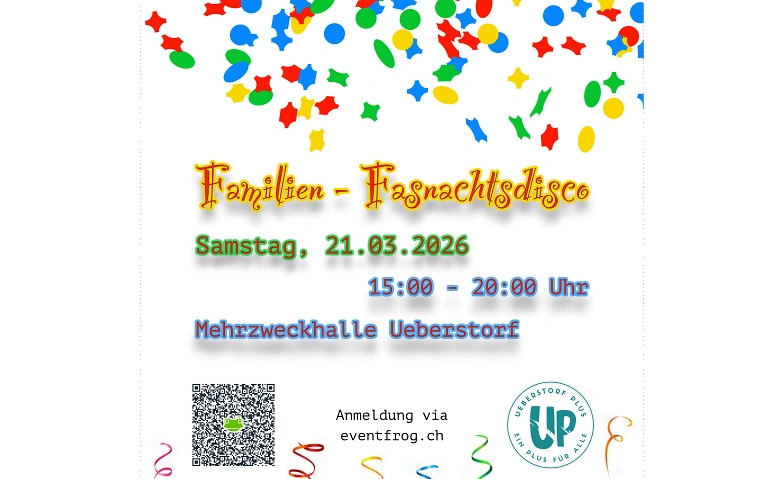 Am Samstag, 21.03.2026, findet in der Mehrzweckhalle Ueberstorf eine Familien-Fasnachtdisco statt. Musik, Tanz und jede Menge Spass stehen auf dem Programm. Verkleidung erwünscht. Für das leibliche Wohl wird ebenfalls gesorgt.