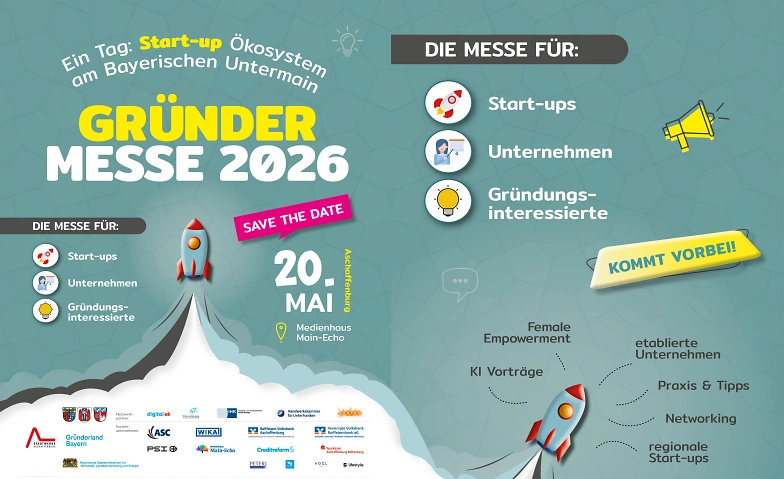 Am 20. Mai 2026 ist es wieder soweit: Die vierte Gründermesse bringt in Aschaffenburg Start-ups, regionale Unternehmen, Beratungsstellen und Gründungsinteressierte zusammen. Die Messe ist eine Kooperation des Digitalen Gründerzentrums Aschaffenburg mit den Partnern Medienhaus Main-Echo, Stadt Aschaffenburg und Digital Aschaffenburg. Die erstmals 2022 ins Leben gerufene Gründermesse hat sich seitdem zu einer festen Plattform für Networking und Inspiration im Start-up-Ökosystem am Bayerischen Untermain entwickelt.