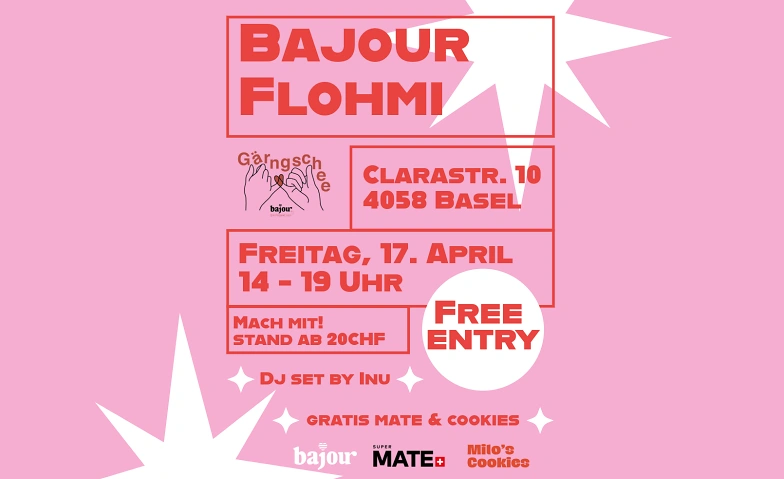 Am Freitag17. April 2026 verwandeln wir das Bajour-Büro an der Clarastrasse von 14 bis 19 Uhr in einen Community-Flohmi – eine Mischung aus nachhaltigem Shopping und Live-Sounds von DJ Inu inmitten der Bajour-Community. Für die passende Erfrischung sorgen die legendären Milos Cookies und Mate vom Supernatural Club (solange der Vorrat reicht!).