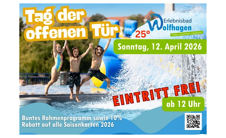 Erlebnisbad Wolfhagen: Start bei freiem Eintritt Erlebnisbad Wolfhagen, Sudetenstraße 4, 34466 Wolfhagen Billets