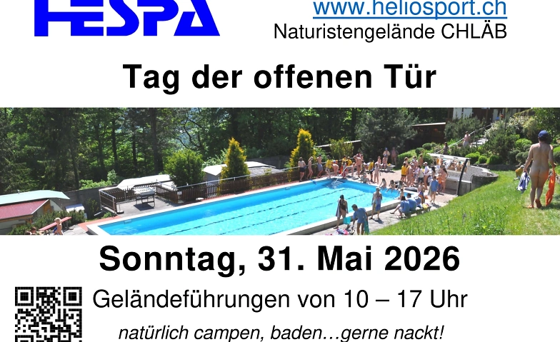 Am Tag der offenen Tür bekommst Du einen Eindruck über den Naturistenverein Heliosport und das Aargauer Naturistengelände ‚Chläb‘ in Auenstein. Ungezwungen unter Freunden zu sein, ist ein Bedürfnis aller Menschen. Am Sonntag 31. Mai von 10.00 bis 17.00 Uhr sind die Türen für alle Interessierte geöffnet. Vereinsmitlieder begleiten Dich und Deine Familie durch das wunderschön gelegene Gelände, am Südhang der Gisliflue, zeigen die Infrastruktur und erklären das Wesentliche zum Naturismus. Für die mutigen Besucher kann auch das nackte sonnenbaden und schwimmen im solarbeheizten Pool ausprobiert werden. Bitte besucht unsere Home-Page für weitere Informationen. www.heliosport.ch