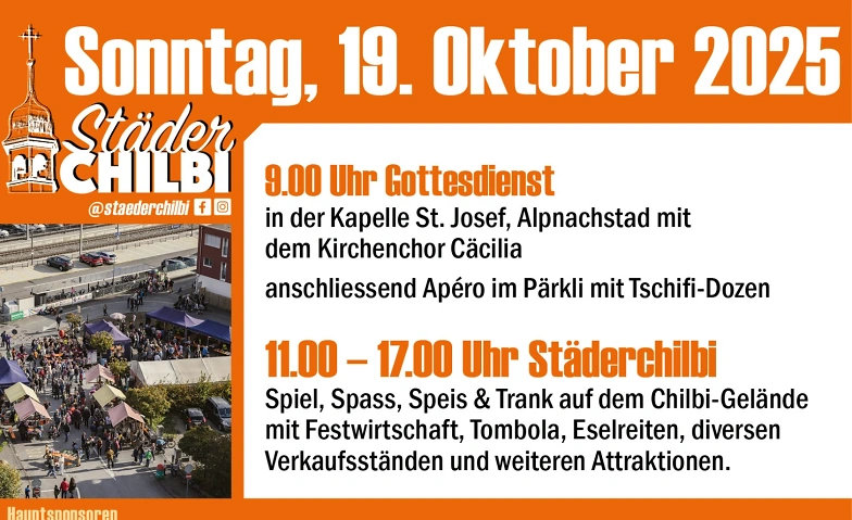 Am Sonntag, 19. Oktober findet in Alpnachstad wieder die Städerchilbi statt. Den Kirchweihgottesdienst der Kapelle St. Josef feiern wir um 9 Uhr mit dem Kirchenchor Cäcilia. Während des anschliessenden Apéros im Pärkli nebenan spielt die Kleinformation «Tschifi-Dozen» eingängige Stücke und feuert die Vorfreude auf die Chilbi an!