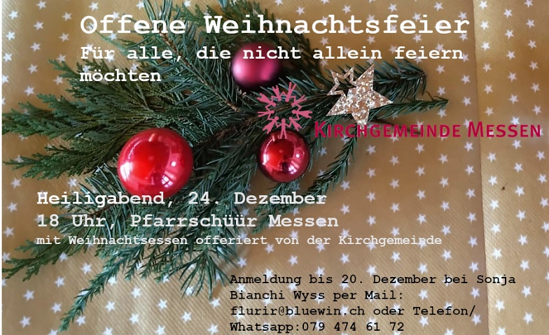 Aus organisatorischen Gründen bitten wir Sie, sich bis am 20. Dezember anzumelden bei Sonja Bianchi Wyss per Mail: flurir@bluewin.ch oder Telefon/WhatsApp: 079 474 61 72 oder bei Pfarrerin Christine Dietrich: christine.dietrich@kirchgemeinde-messen.ch