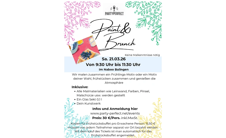 Beim Paint & Brunch im gemütlichen Naboo in Balingen erwartet dich eine einzigartige Mischung aus Kreativität, Genuss und entspannter Wohlfühlatmosphäre. Gemeinsam malen wir ein Frühlinghaftes Motiv – oder du entscheidest dich ganz frei für ein Motiv deiner Wahl. Schritt für Schritt entsteht dein persönliches Kunstwerk, ganz ohne Vorkenntnisse und in entspannter Runde.