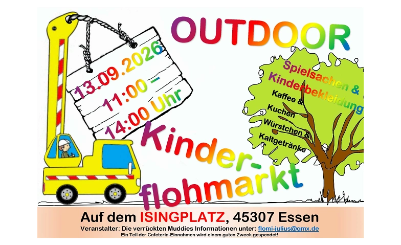 Entdecken Sie beim Flohmarkt rund ums Kind von 11 bis 14 Uhr in Essen an vielen Ständen mit Kinderbekleidung, Spielsachen, Büchern, Autositzen und vielem mehr. Stöbern, feilschen und tauschen Sie in entspannter Atmosphäre – perfekt für Familien und Schnäppchenjäger.