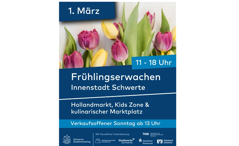 Am 1. März 2026 findet in der Schwerter Innenstadt die Veranstaltung „Frühling in Schwerte“ statt. Anlass ist ein verkaufsoffener Sonntag, der den Beginn der Frühlingssaison begleitet. Besucher*innen erwartet ein vielfältiges Angebot aus Einkaufsmöglichkeiten, Gastronomie und Freizeitaktivitäten.
