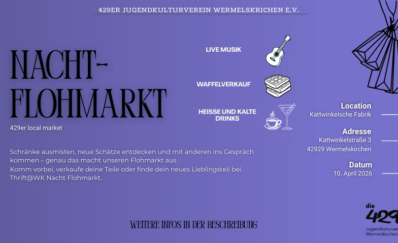 Am Freitag, den 10. April 2026, veranstaltet der 429er Jugend- und Kulturverein einen Nachtflohmarkt in der Kattwinkelschen Fabrik in Wermelskirchen. Von 19 bis 24 Uhr können Besucher*innen in besonderer Abendatmosphäre nach kleinen Schätzen, Raritäten und Alltagsgegenständen stöbern.