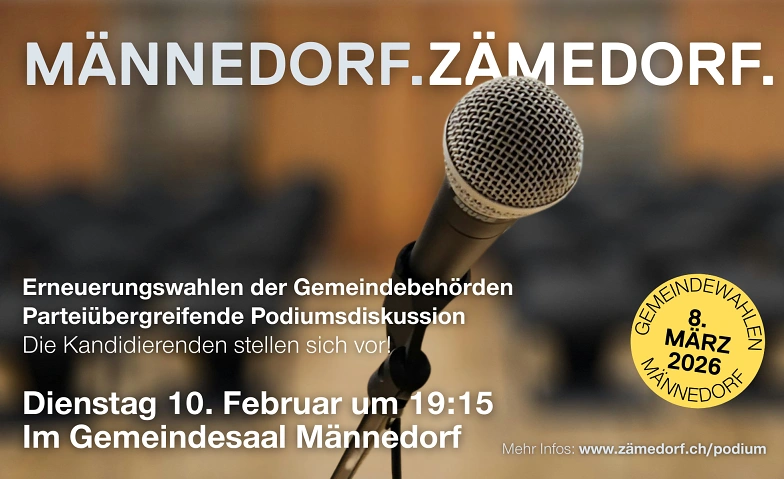 Gemeindewahlen 2026: Podiumsdiskussion & Vorstellungsrunde Gemeindesaal Männedorf, Alte Landstrasse 250, 8708 Männedorf Billets