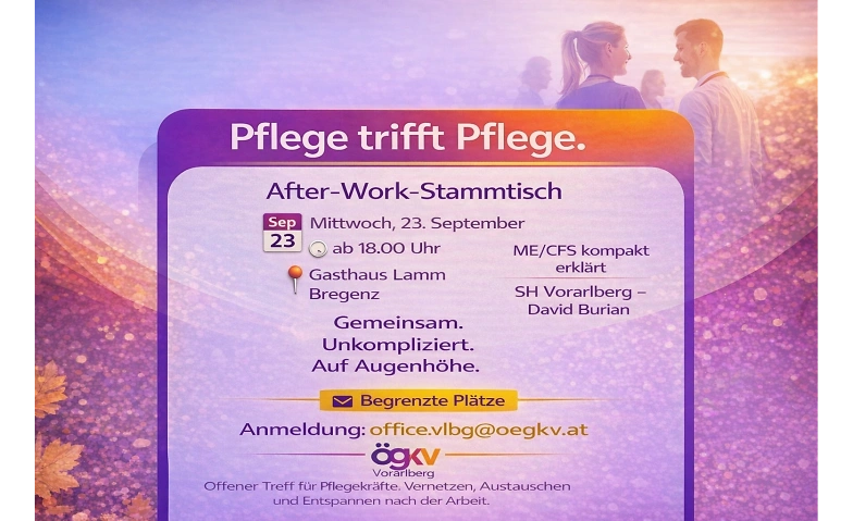 Erleben Sie den Afterwork-Stammtisch „Pflege trifft Pflege“ – eine ideale Gelegenheit zum Austausch unter Pflegefachpersonen und Interessierten. Dieses Mal steht ein besonderer Vortrag von David Burian im Mittelpunkt, der persönlich über das Thema ME/CFS informiert und Einblicke in die Krankheit gibt.