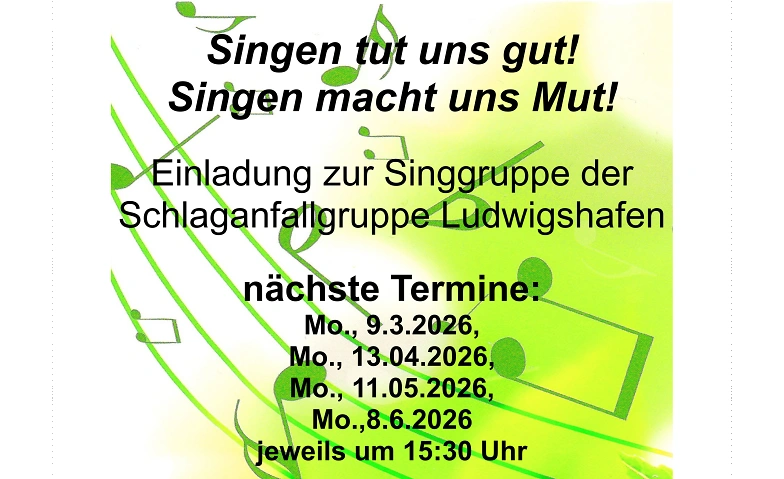 Am Montag, dem 9. März 2026, findet das nächste Treffen der Singgruppe der Schlaganfallgruppe Ludwigshafen statt. Es beginnt um 15.30 Uhr im Schiller-Wohnstift in Ludwigshafen-Oggersheim (Kapellengasse 25). Im Mittelpunkt stehen Lieder und Kanons, Tipps und Anregungen für das Wahrnehmen und Verbessern der eigenen Atmung und den Umgang mit Stimme und Sprache.