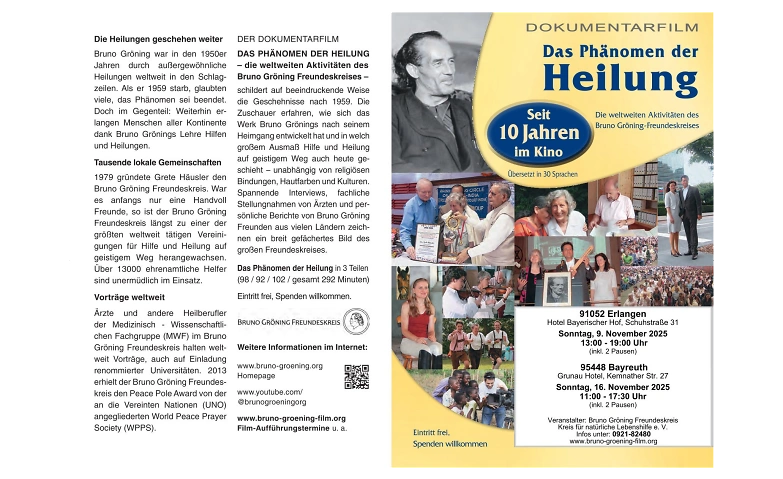 Der Dokumentarfilm „Das Phänomen der Heilung“ gibt einen umfassenden Einblick in die Aktivitäten des Bruno Gröning Freundeskreises, eine der weltweit größten Vereinigungen zum Thema Heilung auf geistigem Weg, und zeigt den Wahrheitsgehalt der Aussage Bruno Grönings auf, dass Heilungen auch nach seinem Lebensende erfahrbar sein können. Menschen aus 35 Ländern geben sehr berührend Einblick in ihre wunderbaren Erlebnisse, Hilfen und Heilungen durch die Aufnahme des Heilstroms – unabhängig von religiösen Bindungen, Hautfarbe und Kulturen. Ärzte der Medizinisch-Wissenschaftlichen-Fachgruppe aus der ganzen Welt berichten und kommentieren diese Heilungen, die durch die Umsetzung der Lehre Bruno Grönings geschehen sind.