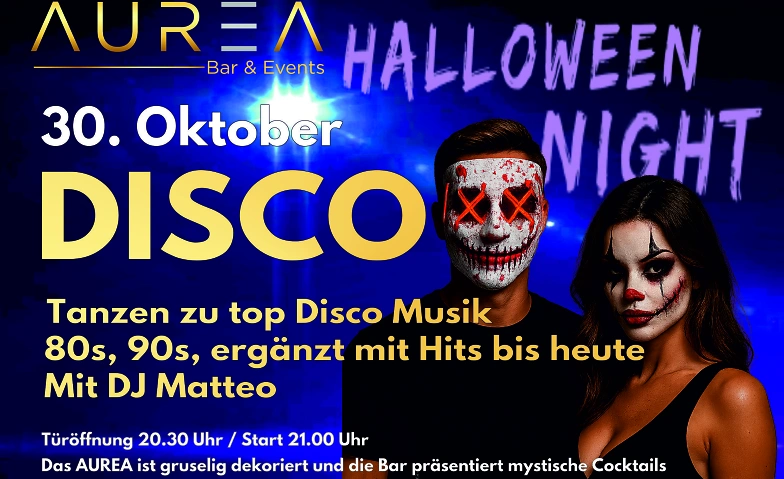 Das gruselig dekoriert AUREA lädt dich ein für einen super Tanzmoment. Komm im Kostüm, dann macht das Ganze gleich noch mehr Spass. Falls du keine Lust hast auf Kostüm ist das natürlich auich ok. Der Spass steht im Vordergrund, egal ob nur Tanzen oder Tanzen und Kostüm