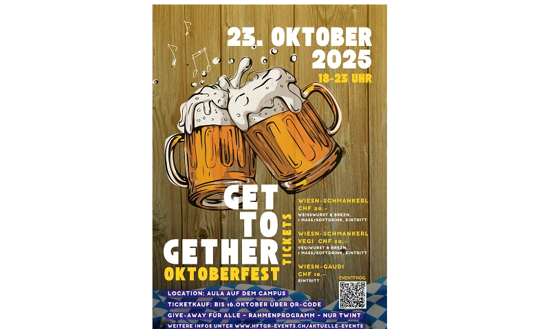 Am Donnerstag, 23. Oktober verwandelt sich unsere Aula in ein echtes Wiesn-Festzelt! Von 18:00 bis 23:00 Uhr erwarten euch bayerische Spezialitäten, stimmungsvolle Musik und jede Menge Gaudi.