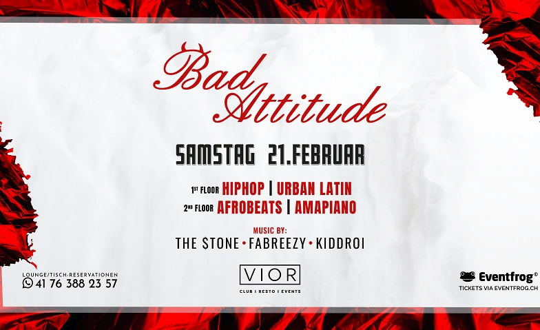 Mit regelmäßig 800 bis 1000 Gästen ist Bad Attitude der Treffpunkt für alle Bad Boys & Bad Girls, die Hip-Hop nicht nur hören, sondern leben. Harte Beats, fette Basslines und kompromisslose Sounds sorgen für eine explosive Atmosphäre, die den VIOR Club zum Kochen bringt.