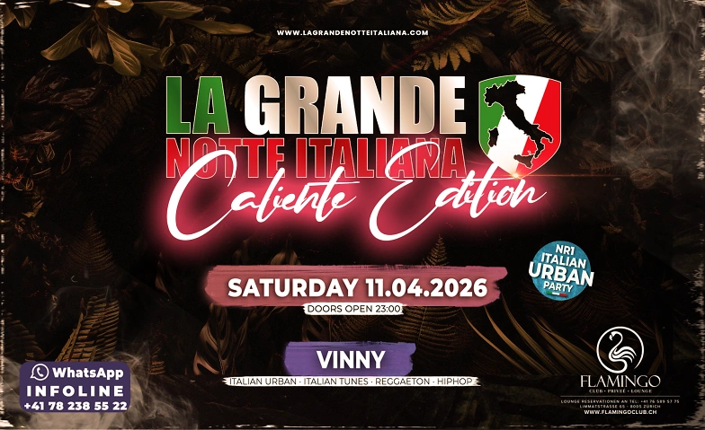 The Most Famous ITALIAN URBAN Party from Switzerland. La Grande Notte Italiana - Caliente Edition ist eine eine explosive Mischung, die das Beste der urbanen, Hip-Hop- und Reggaeton-Musik aus Italien präsentiert.