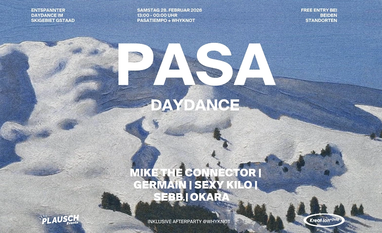 Gemeinsam mit unseren Freund:innen von KreationLab aus Frutigen feiern wir am 28. Februar 2026 von 13:00 bis 00:00 die 2. Edition des Pasa Daydance. Wir starten im Pasatiempo mit treibenden House-Vibes und ziehen bei Einbruch der Nacht weiter ins WhyKnot, um die Party gebührend fortzusetzen.
