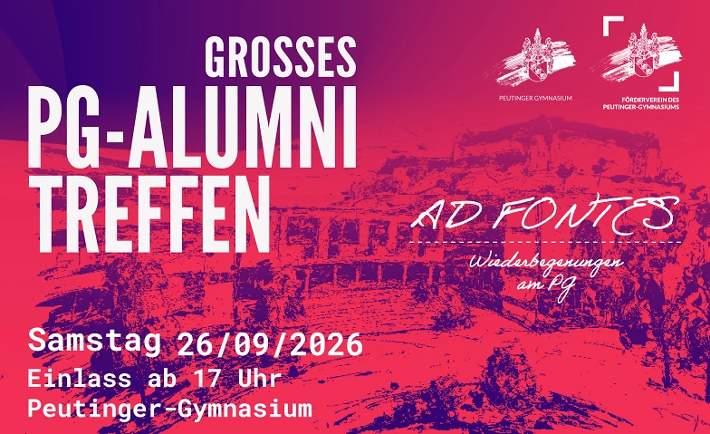Feiern Sie mit uns unter dem Motto »Ad fontes« - Wiederbegnungen am PG das große PG-Alumnitreffen am 26. September 2026. Treffen Sie Freundinnen und Freunde aus ihrer Schulzeit und entdecken sie ihr altes Peutinger-Gymnasium neu: Tradition trifft Zukunft. Mit der Landesgartenschau in Ellwangen 2026 erhält das Fest zugleich einen würdigen Anlass wie einen blühenden Rahmen.