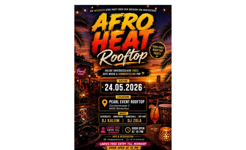 Erlebe die heisseste Afroparty über den Dächern von Winterthur! Lass dich von pulsierenden Beats und mitreissenden Rhythmen in einzigartiger Atmosphäre verführen. Geniesse die spektakuläre Aussicht, feiere ausgelassen und tanze die Nacht durch.