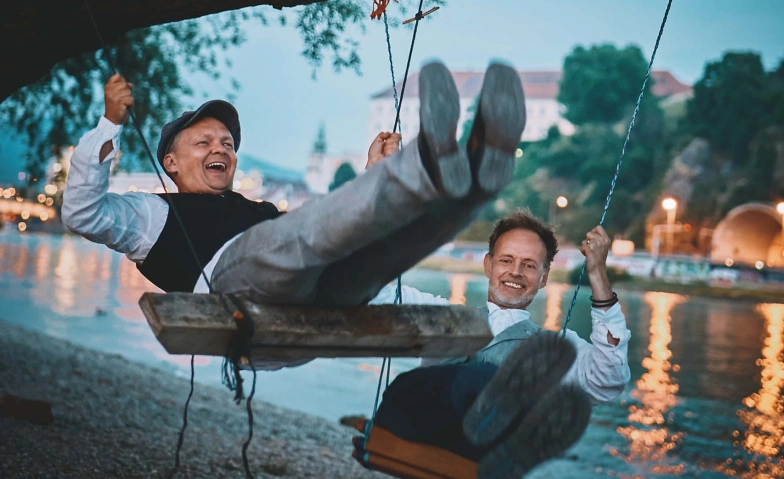 Robert Blöchl und Roland Penzinger, zusammengenommen „BlöZinger“, sind die Erfinder und Großmeister des KopfKinoKabaretts. Ein Film. Live gespielt auf der Bühne. Mit einem Minimum an Requisiten. Und einem Maximum an Ideen, mit denen BlöZinger Vorstellungskraft und Lachmuskeln ihrer Zuschauerinnen und Zuschauer zu Höchstleistungen animieren. Da werden untrainierte Zwerchfelle gedehnt und eingerostete Gehirnwindungen geölt. Mit schauspielerischer Raffinesse und einer großen Portion „Schmäh“ erwecken BlöZinger ihre skurrilen Bühnenfiguren zum Leben, wechseln blitzschnell die Rollen und bringen jeden Charakter derart genial auf den Punkt, dass dem Publikum gar keine Wahl bleibt, als sich in den geistreich-vergnüglichen Kosmos ziehen zu lassen, den BlöZinger auf der Bühne erschaffen. Und natürlich gibt’s dazu doch eine Leinwand – sogar die größte der Welt: unsere Fantasie.