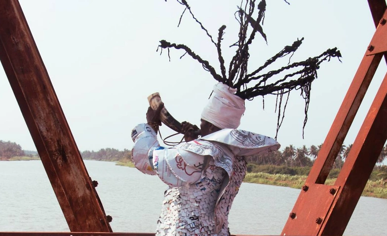 Prince Toffa (Benin) erschafft grosse skulpturale Kleider aus recycelten Materialien wie Dosen, Bechern, Draht, Tüten, Plastiktaschen und mehr. Sobald die Kostüme fertiggestellt sind, erweckt der Künstler sie durch künstlerische Performances zum Leben. So gibt er Abfallmaterialien ein zweites Leben, während er zugleich die Geschichte des Künstlers, seines Landes und seiner Bräuche erzählt.