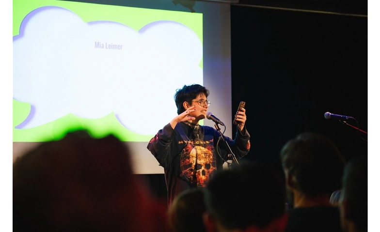 Gina Walter (sie/ihr) und Jonas Balmer (er/ihm) von Slam Basel organisieren den Abend voll von fantasievollen und wilden Gedanken, gefüllt von sanft klingenden Sprachmelodien und kraftvoll erschallenden Wortgebilden.