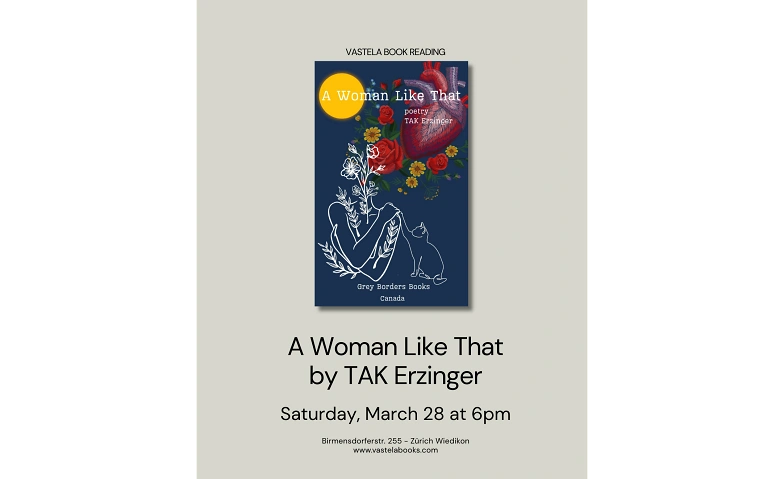 Vastela Books invites you to the book reading and release of A Woman Like That (Grey Borders Books 2026, Canada) by the award-winning poet TAK Erzinger.