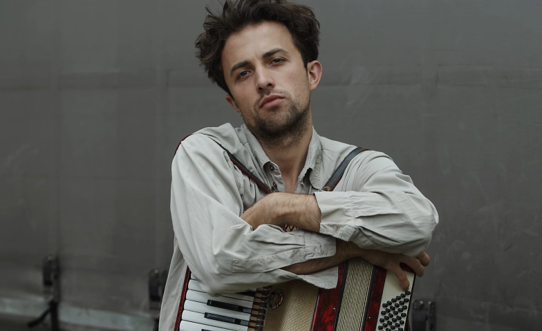 Jakob Gühring interpretiert vielsprachig und virtuos, begleitet seine Chansons dabei selbst an Klavier, Gitarre und Akkordeon.