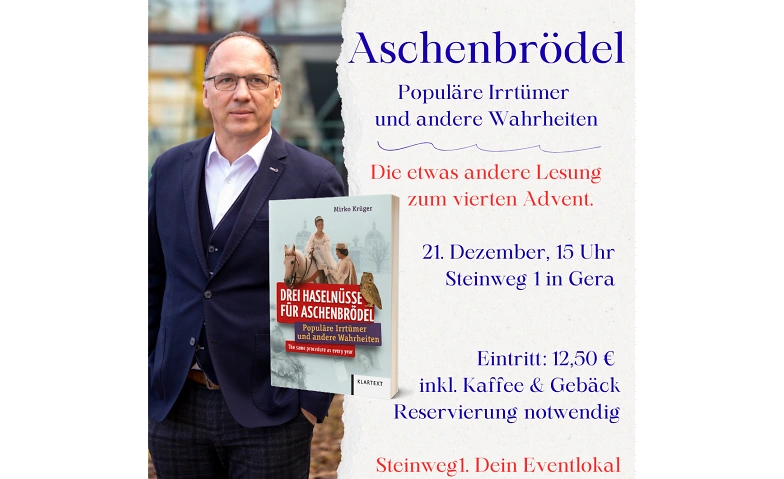 Alle Jahre wieder ist „Drei Haselnüsse für Aschenbrödel“ das am häufigsten ausgestrahlte Märchen im deutschen Fernsehen. Doch woher rührt diese stete Begeisterung? Während einer Lesung im Geraer Eventlokal „Steinweg1“ erzählt Mirko Krüger populäre Irrtümer und andere Wahrheiten über den Kultfilm. Der Autor verspricht für den 21. Dezember einen unterhaltsamen wie informativen Nachmittag, der selbst eingefleischte Fans überraschen dürfte. Krüger hat an der Filmhochschule in Babelsberg studiert. In den dortigen Studios war der Film unter anderem gedreht worden.