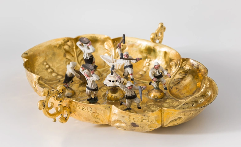 Credits: Henkelschale mit Bergknappen, Herrengrund (Špania Dolina), 2. Hälfte 17. Jahrhundert, Kupfer, getrieben, graviert, vergoldet, Figuren: Silber, gegossen und kaltbemalt, Abegg-Stiftung, Inv. Nr. 8.166.69. © Abegg-Stiftung (Foto: Christoph von Viràg)