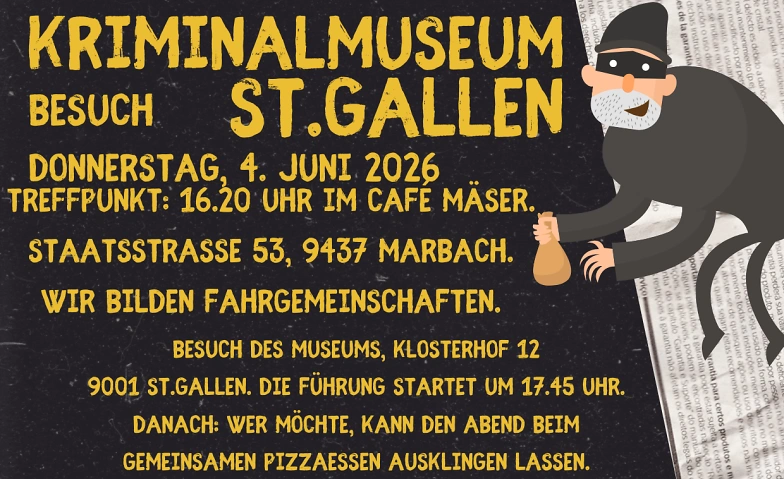 Tauche gemeinsam mit anderen neugierigen Singles in die faszinierende Welt der Kriminalgeschichte ein! Bei einer spannenden Führung durch das Kriminalmuseum entdecken wir echte Fälle, historische Exponate und überraschende Hintergrundstories. Ganz nebenbei bleibt genug Zeit für Gespräche, gemeinsames Staunen und neue Kontakte – vielleicht sogar mit einem kleinen Funken Krimi‑Romantik. Den Abend lassen wir in einer Pizzeria ausklingen. (freiwillig). Mehr Infos: www.tomonkavogt.ch